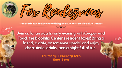 Fox Rendezvous is a unique, adults-only evening at the Biophilia Center featuring food, drinks, and the opportunity to meet the Center’s resident foxes, Cooper and Todd. Guests are invited to enjoy a relaxed night out with friends, loved ones, or someone special while learning more about these fascinating animals.